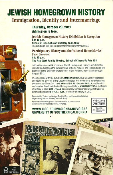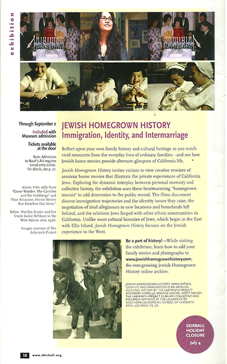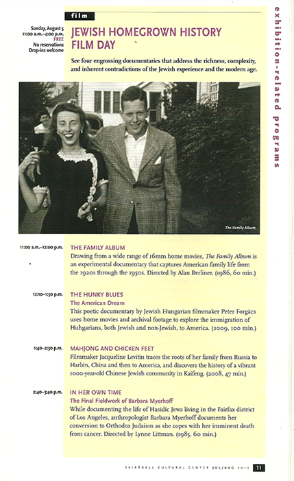 Jewish Homegrown History Film Day , August 5, 2012, Skirball Cultural Center, a program of documentaries about Jews in California, curated by Marsha Kinder, as part of the exhibition Jewish Homegrown History.